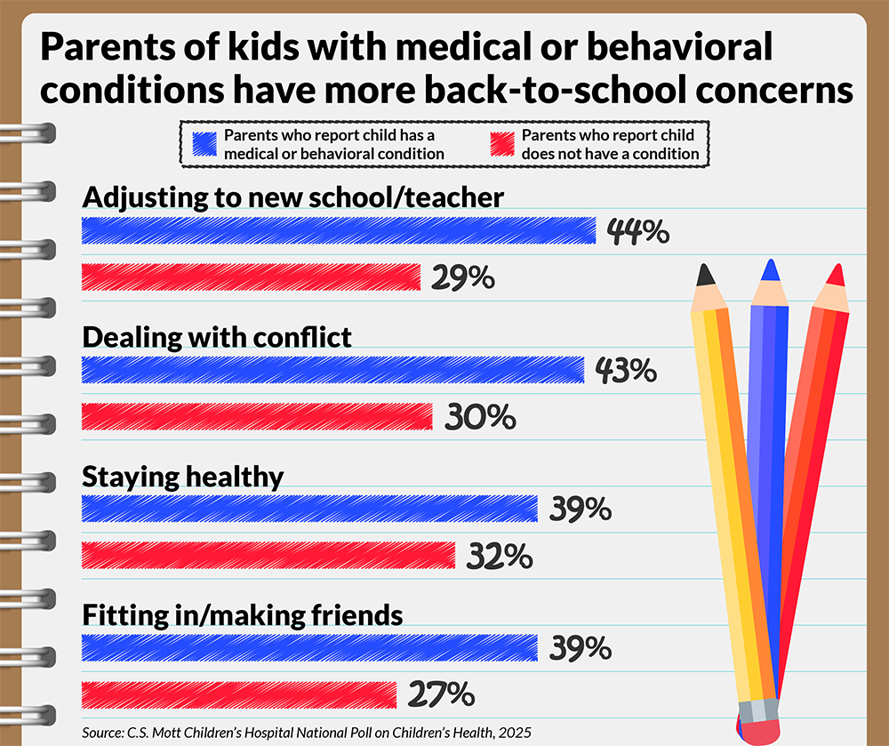 Woolford SJ, Gebremariam A, Schultz SL, Frisk C, Clark SJ. Back to school with medical or behavioral conditions. C.S. Mott Children's Hospital National Poll on Children's Health, University of Michigan. Vol 48, Issue 1, September 2025. Available at: https://mottpoll.org/reports/back-school-medical-or-behavioral-conditions.