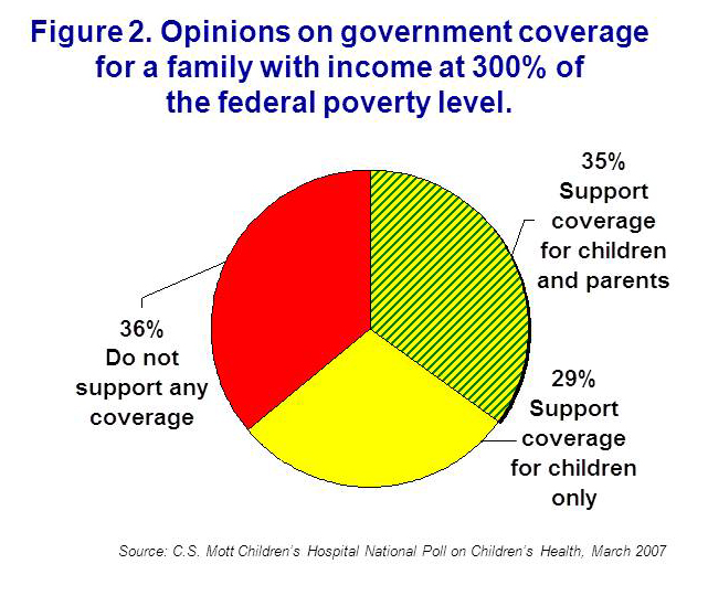 In March 2007, the C.S. Mott Children’s Hospital’s National Poll on Children’s Health surveyed a nationally representative sample of households with and without children under age 18, regarding who should qualify for government-sponsored health plans based on yearly family income in ranges served by SCHIP.