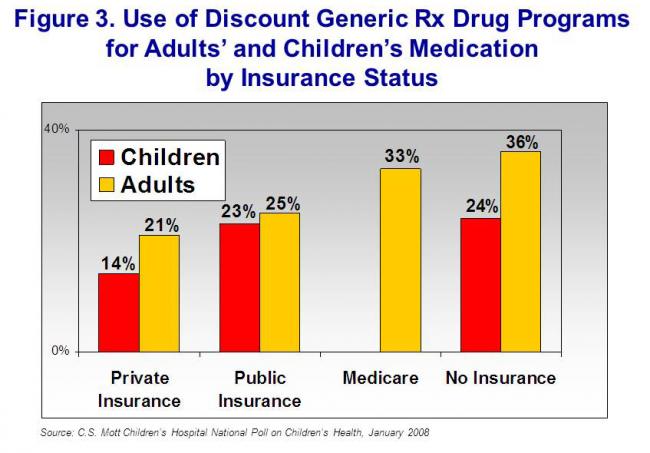 Davis MM, Singer DC, Butchart AT, Clark SJ. Nearly 70 million Americans using discount generic Rx programs. C.S. Mott Children’s Hospital National Poll on Children’s Health, University of Michigan. Vol 3, Issue 2, February 2008. Available at: http://mottpoll.org/reports-surveys/nearly-70-million-americans-using-discount-generic-rx-programs.