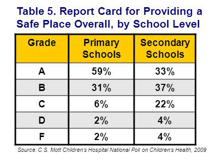 Overall, 33% of parents give their children's secondary schools an “A” grade for providing a safe place for students, while 59% of parents give primary schools an  “A” (Table 5).